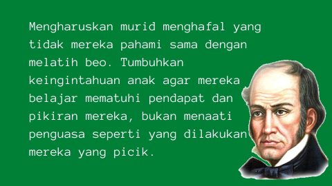 Mengharuskan murid menghafal yang tidak mereka pahami sama dengan melatih beo. Tumbuhkan keingintahuan anak agar mereka belajar mematuhi pendapat dan pikiran mereka, bukan menaati penguasa seperti yang dilakukan mereka yang picik, atau menaati adat kebiasaan seperti kita yang dungu. Ia yang tak tahu apa-apa, gampang dibodohi. ia yang tak punya apa-apa, gampang dibeli.