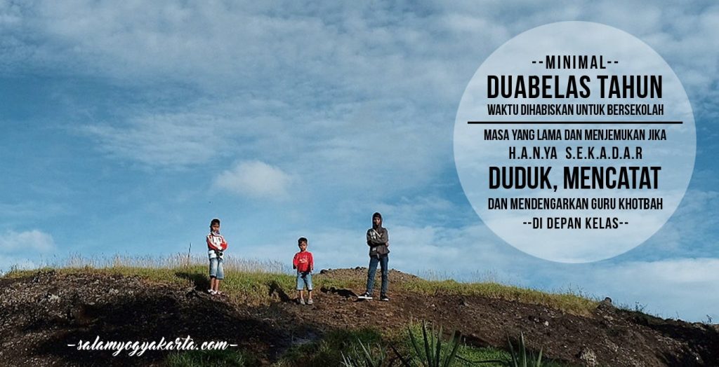 Saya nyengir. Sudah. Sudah kami coba. Meski memang tidak sebanyak sekarang. Kami mendapatkan banyak pelajaran selama proses mencari. Sekolah formal, apapun sebutannya adalah sebuah institusi yang berjalan seirama, dimana-mana kemasannya serupa. Akan selalu ada acara baris berbaris sebelum masuk ke dalam kelas, bermain dengan teman-teman ketika jam istirahat dimulai, dan selalu akan ada aturan yang membuat muridnya seragam dalam berperilaku, bertutur, berbusana, dan bisa jadi berpikir juga. Mungkin, sekolah formal yang sempurna dalam pandangan kami itu memang hanya ada di dalam angan-angan.