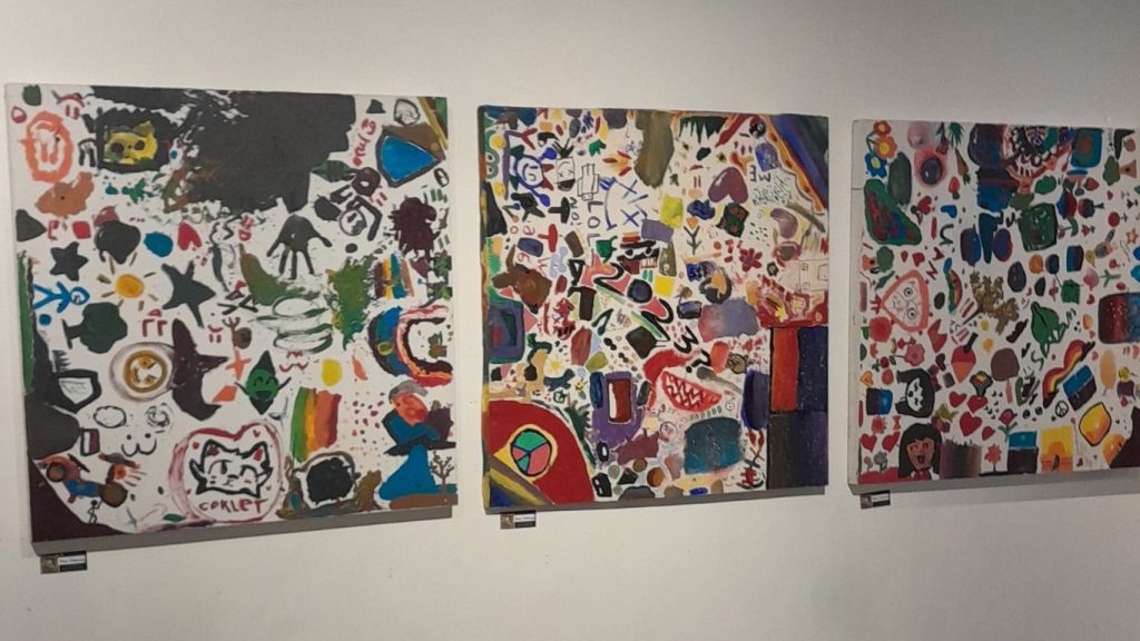 Meski mengusung tema lingkungan, namun pengunjung tidak akan merasakan ‘keseragaman’ dalam karya-karya yang tersaji. Di panel display yang sama, saya menemukan sebuah goresan abstrak yang kemudian direspon dengan arsir pada beberapa kurva yang terbentuk, namun ada juga karya yang sangat ‘lantang’ berbicara tentang krisis iklim dalam goresan spidol dan pensil warna. Di panel yang lain, tersaji tiga karya berukuran besar yang merupakan karya kolaborasi. Kata Bu Widya, salah satu orang tua murid yang aktif terlibat sebagai panitia pameran, spot ini menjdi favorit untuk foto-foto.